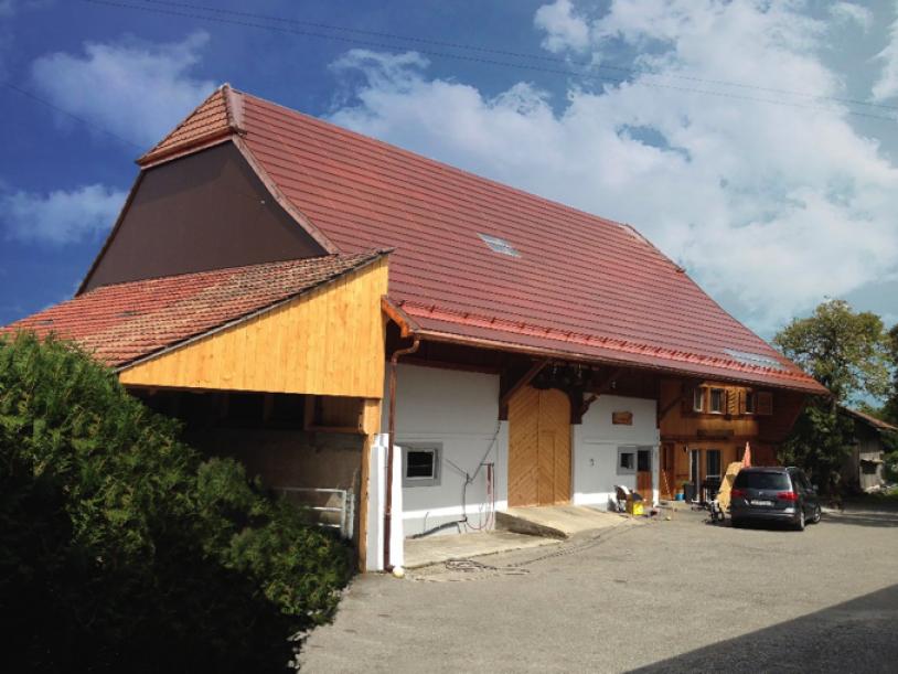 Fig. 1. In Neuchâtel CH. A) “la Maison des Associations”, Swiss Solar Prize 2015 in the Renovation category (source P. Heinstein, EPFL and CSEM). b) Traditional Farm in Ecuvillens, Fribourg (CH) with the Solar-Terra modules produced by ISSOL ( source CSEM), C) Colored active façade produced by Issol for the Union Eiendomsutvikling AS - OSLO (Norway) Arch.IngebjorgLien LOF Arkitekter d) White solar Façade produced by Solaxess SA in Boudry (CH).